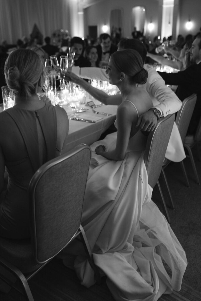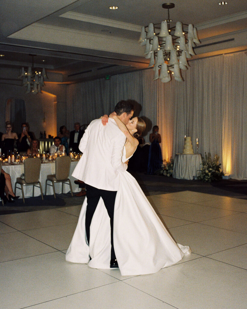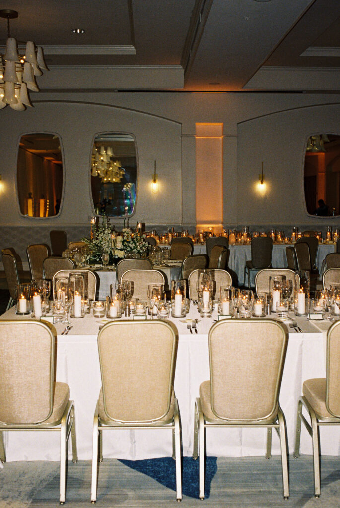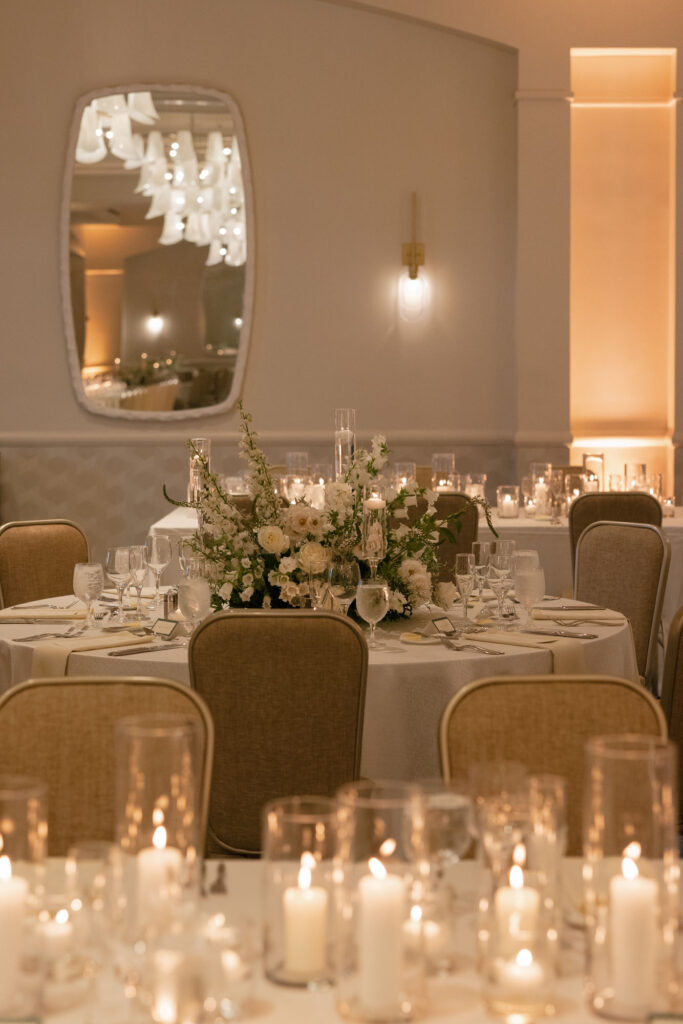 Inside LaPlaya’s ballroom, candles glowed and florals draped across long tables. The design felt elegant without being overly fussy. Soft draping, fresh white blooms, and warm lighting made the space intimate. As the night went on, heartfelt speeches, laughter, and dancing filled the room.